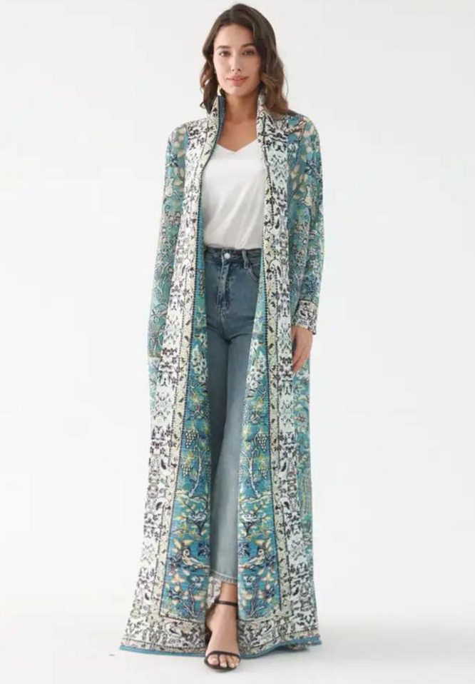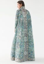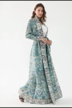 Imagine a flowing turquoise garment that combines the elegance of a Miyake pleat with the modest coverage of an abaya. This unique piece drapes beautifully, featuring Miyake’s signature pleating for a touch of modern design. Made in stunning turquoise colour, it offers a fashionable twist on the traditional abaya.