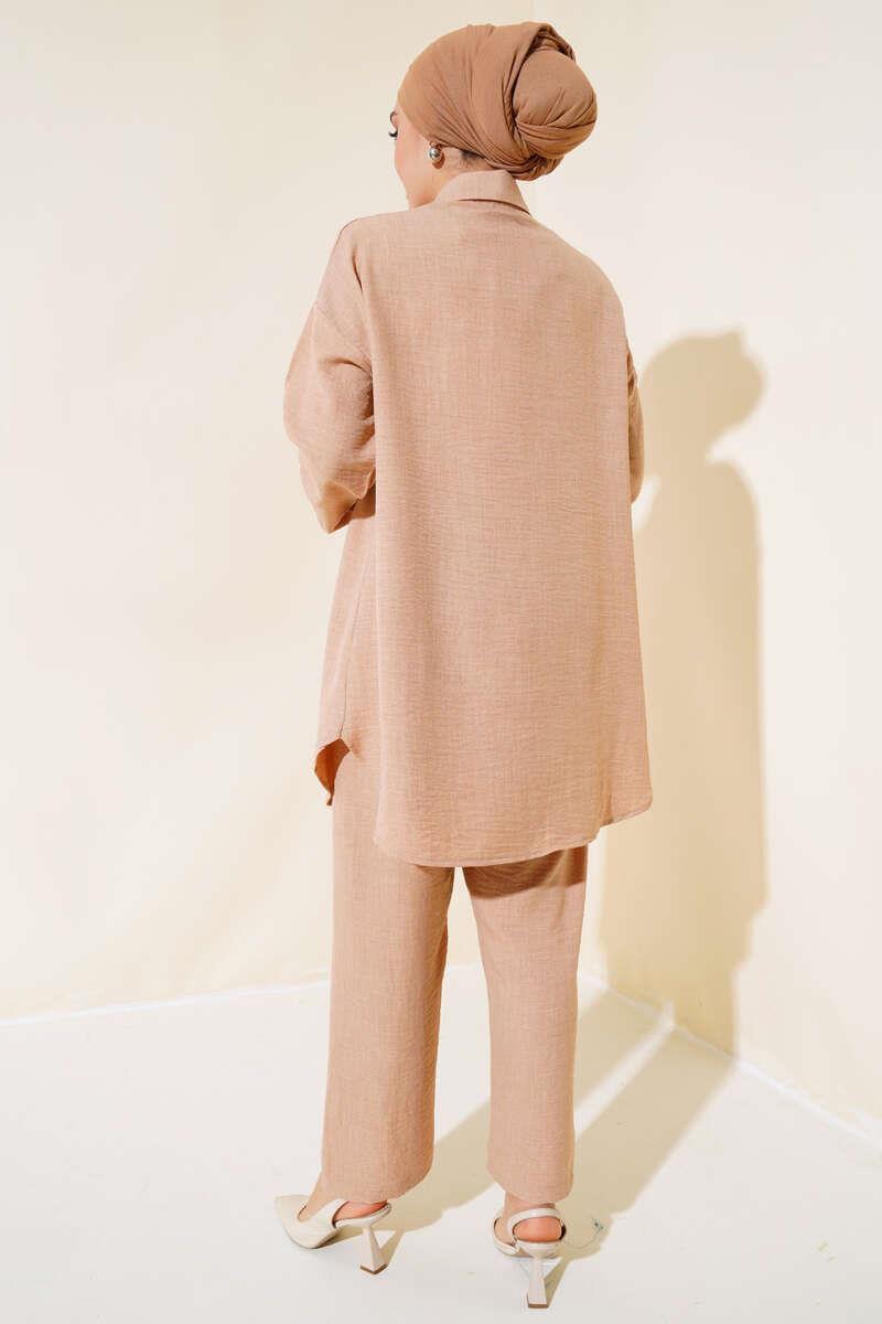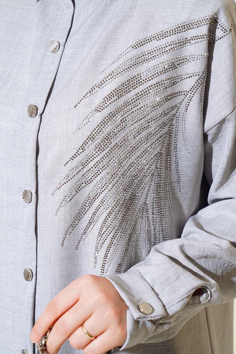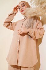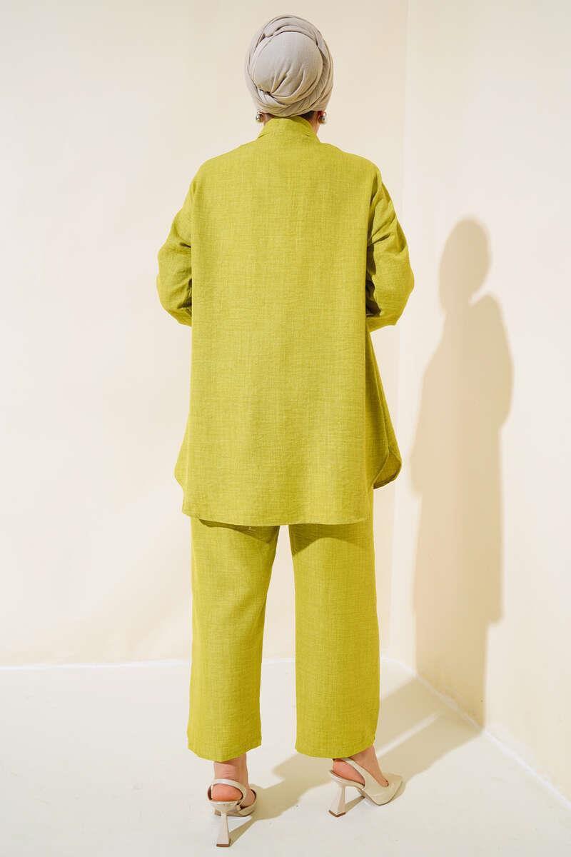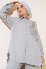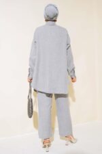 The Turkish Embellished three-color grey, green, camel coord set in medium UK size 10-14 offers a stylish ensemble for the new season. This 2-piece set includes a tunic and trousers, with the tunic featuring a unique buttoned design all around. Crafted from a blend of 50% Viscose, 45% Polyester, and 5% other fibres, this set combines comfort with a touch of elegance, making it a versatile and fashionable choice for various occasions.
