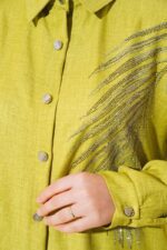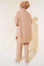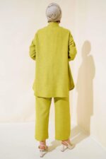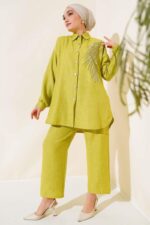 The Turkish Embellished three-color grey, green, camel coord set in medium UK size 10-12 offers a stylish ensemble for the new season. This 2 Piece Set includes a tunic and trousers, with the tunic featuring a unique buttoned design all around. Crafted from a blend of 50% Viscose, 45% Polyester, and 5% other fibers, this set combines comfort with a touch of elegance. Perfect for those looking for a versatile and chic outfit, this coord set is a fashionable choice for various occasions.