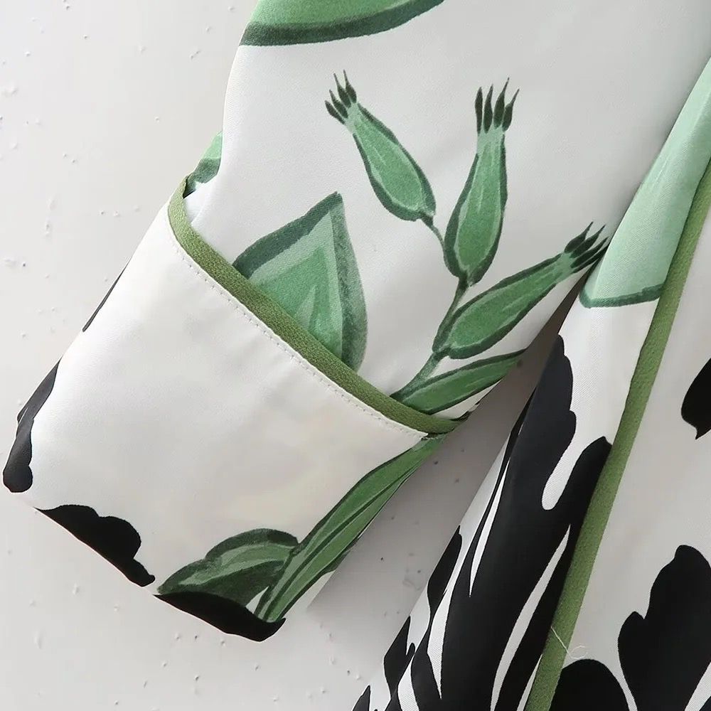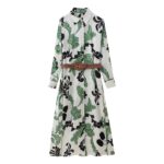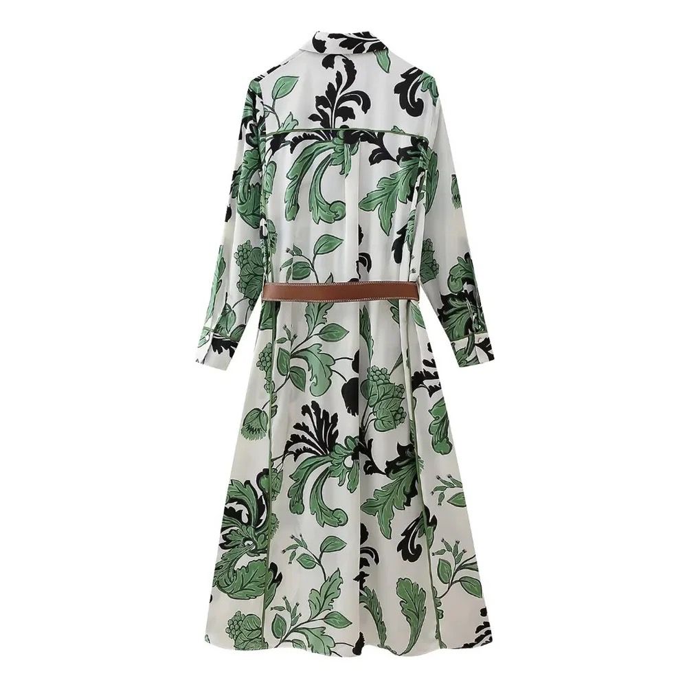 Long Sleeve / Belt Printed Green Long Shirt Dress