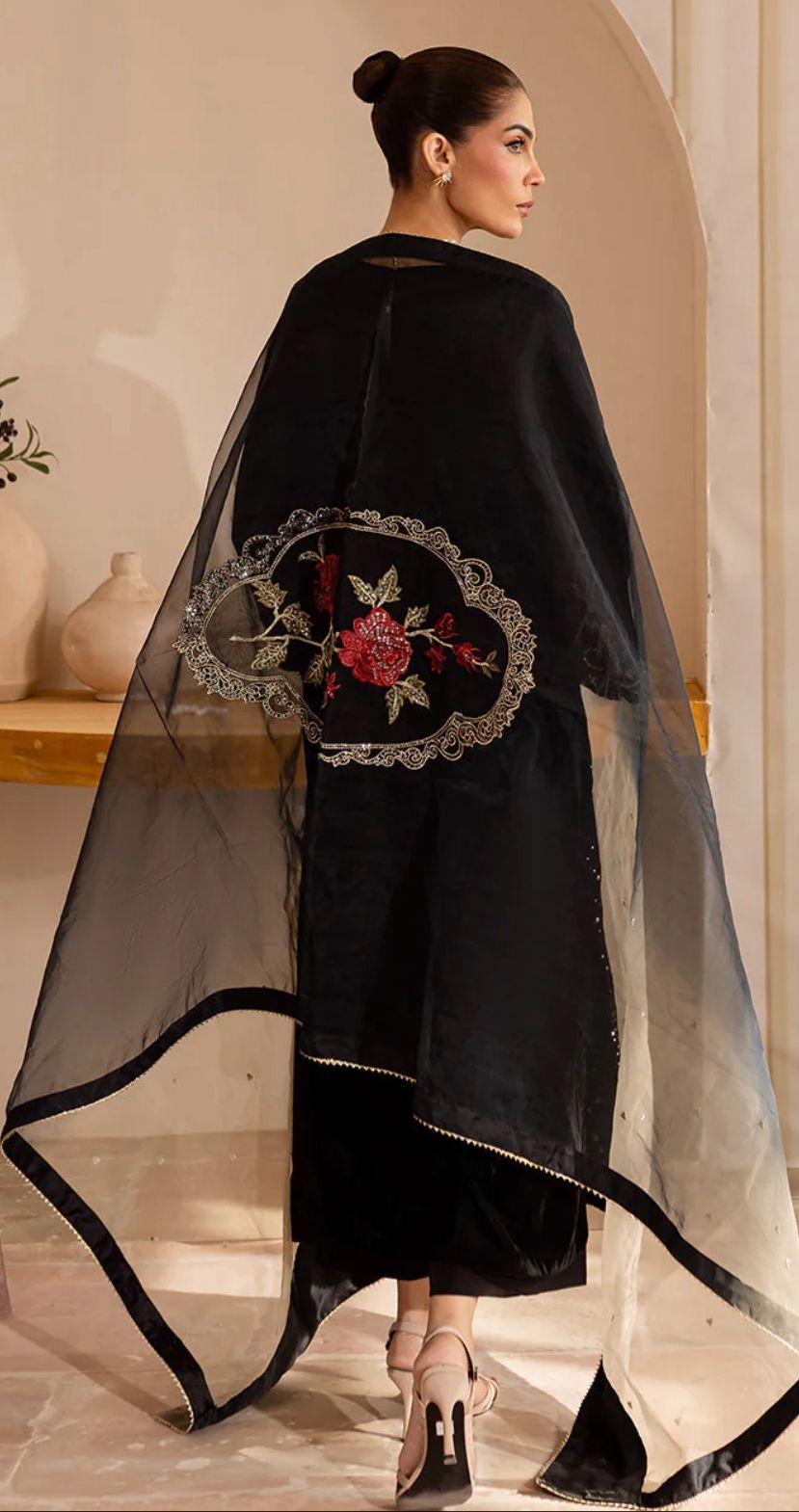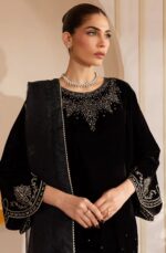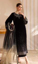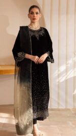 Make a bold and elegant statement with this stunning black velvet ensemble. The shirt features intricate embroidery with shimmering sequins on rich velvet fabric, giving it a luxurious and festive look. It is paired with sleek raw silk trousers that add a graceful finish, while the tie-dye organza dupatta brings a soft, stylish contrast to the outfit.