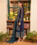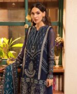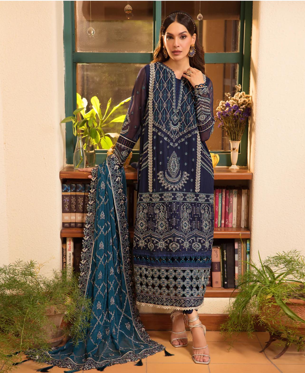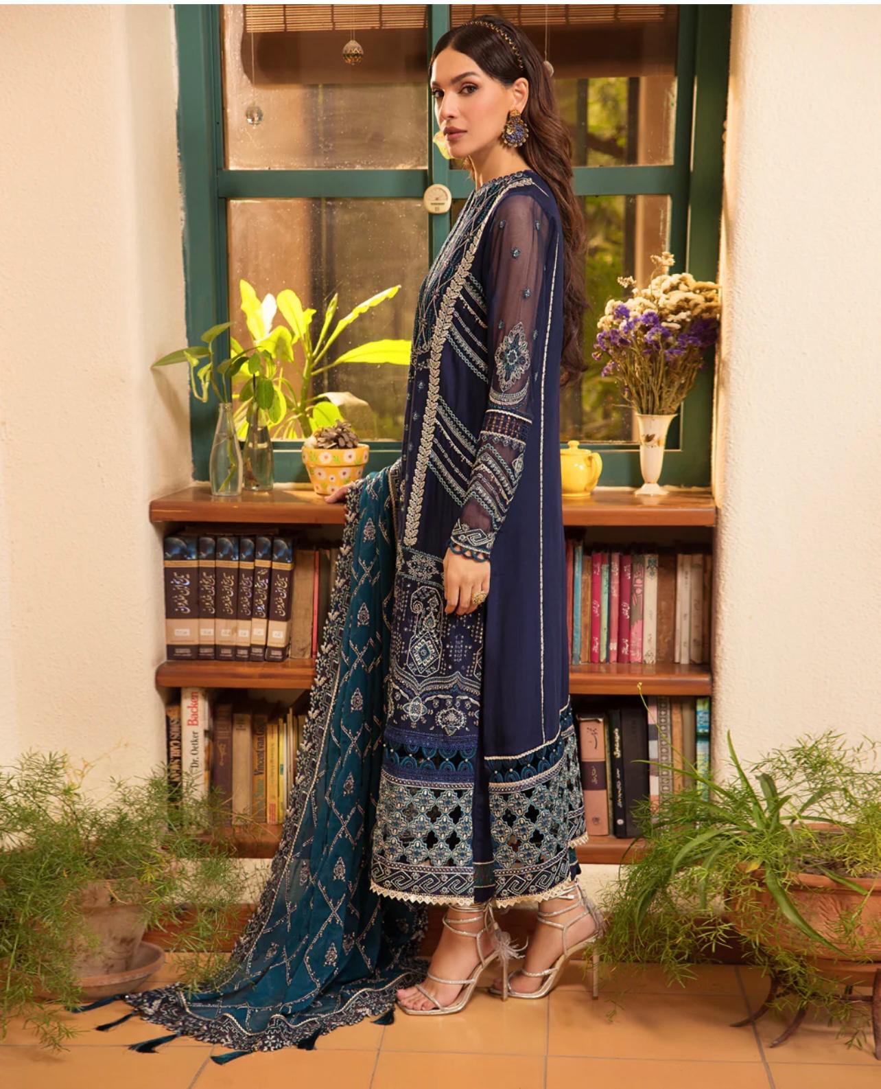 This beautiful three-piece set includes a flowing chiffon shirt, luxurious raw silk trousers, and a delicate organza dupatta. A sophisticated and stylish ensemble perfect for any special occasion.