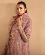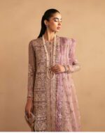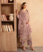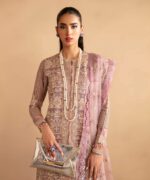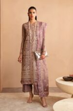 This stunning ensemble features a delicate organza dupatta, a flowing chiffon shirt, and luxurious raw silk trousers. A perfect blend of textures and elegance for any special occasion.