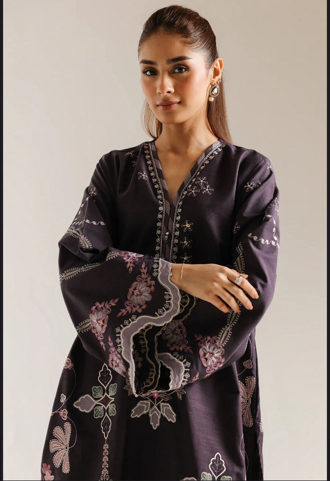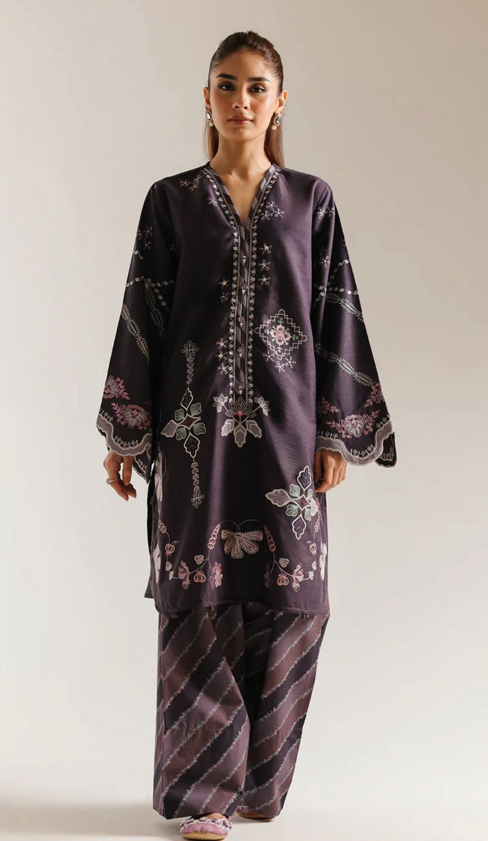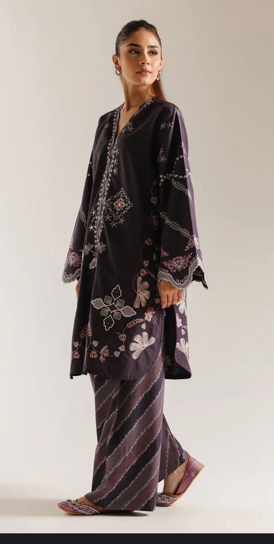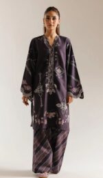 This refined Ethnic embroidered 2-piece suit beautifully combines traditional craftsmanship with modern elegance. The deep dark purple shirt features meticulous floral embroidery and a flattering V-neckline, creating a graceful and polished silhouette. Paired with a coordinated farshi shalwar, adorned with delicate line patterns throughout, the ensemble offers a perfect balance of texture and sophistication.