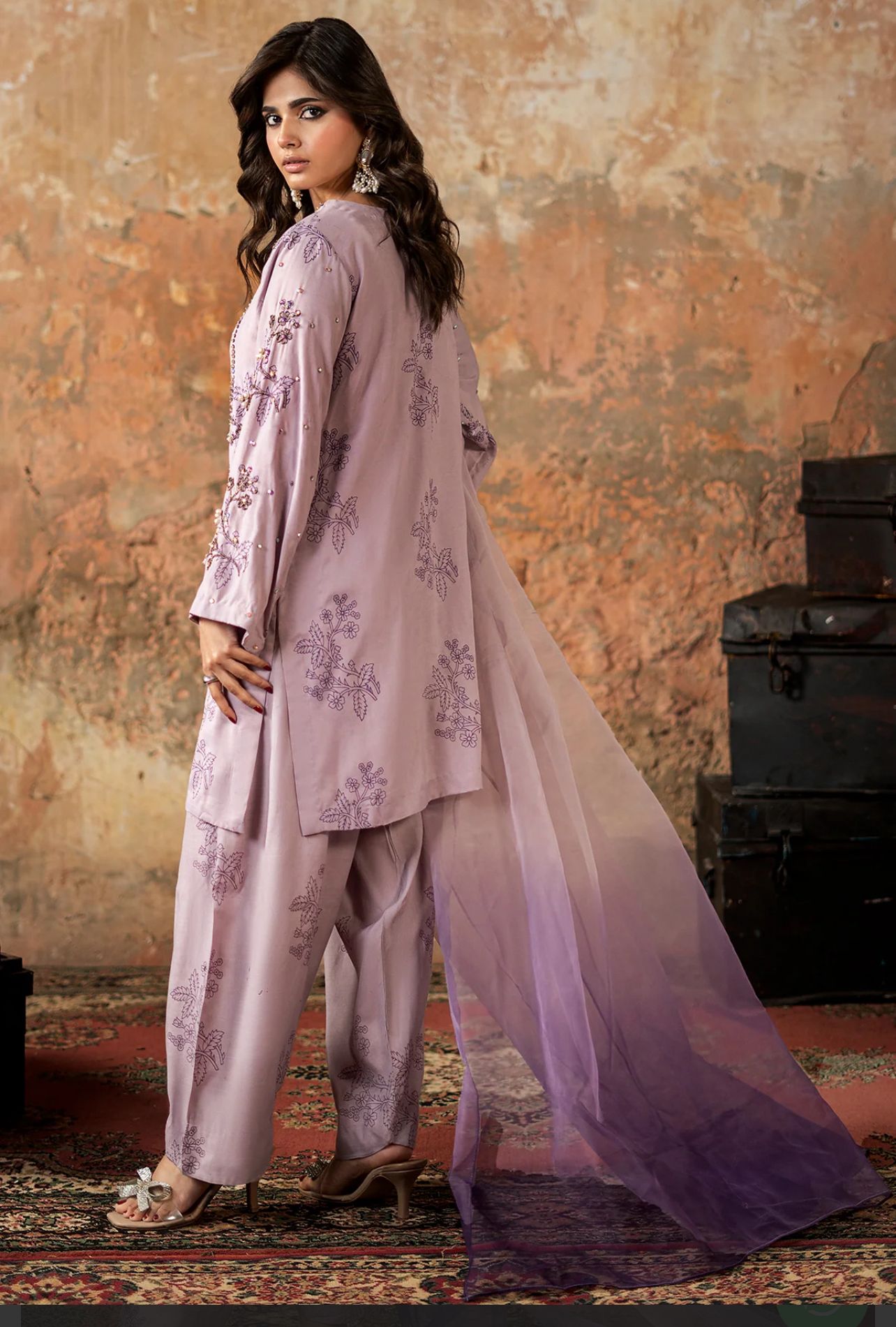A harmonious blend of tradition and artistry, this elegant lilac raw silk tunic is adorned with exquisite hand embellishments and refined French buttons, enhanced by delicate block-printed details that add depth and texture to its graceful silhouette. Paired with a matching raw silk shalwar, the ensemble reflects understated sophistication. The look is beautifully completed with a dark purple ombré dupatta, adding a rich contrast and timeless charm—perfect for festive and semi-formal occasions.
