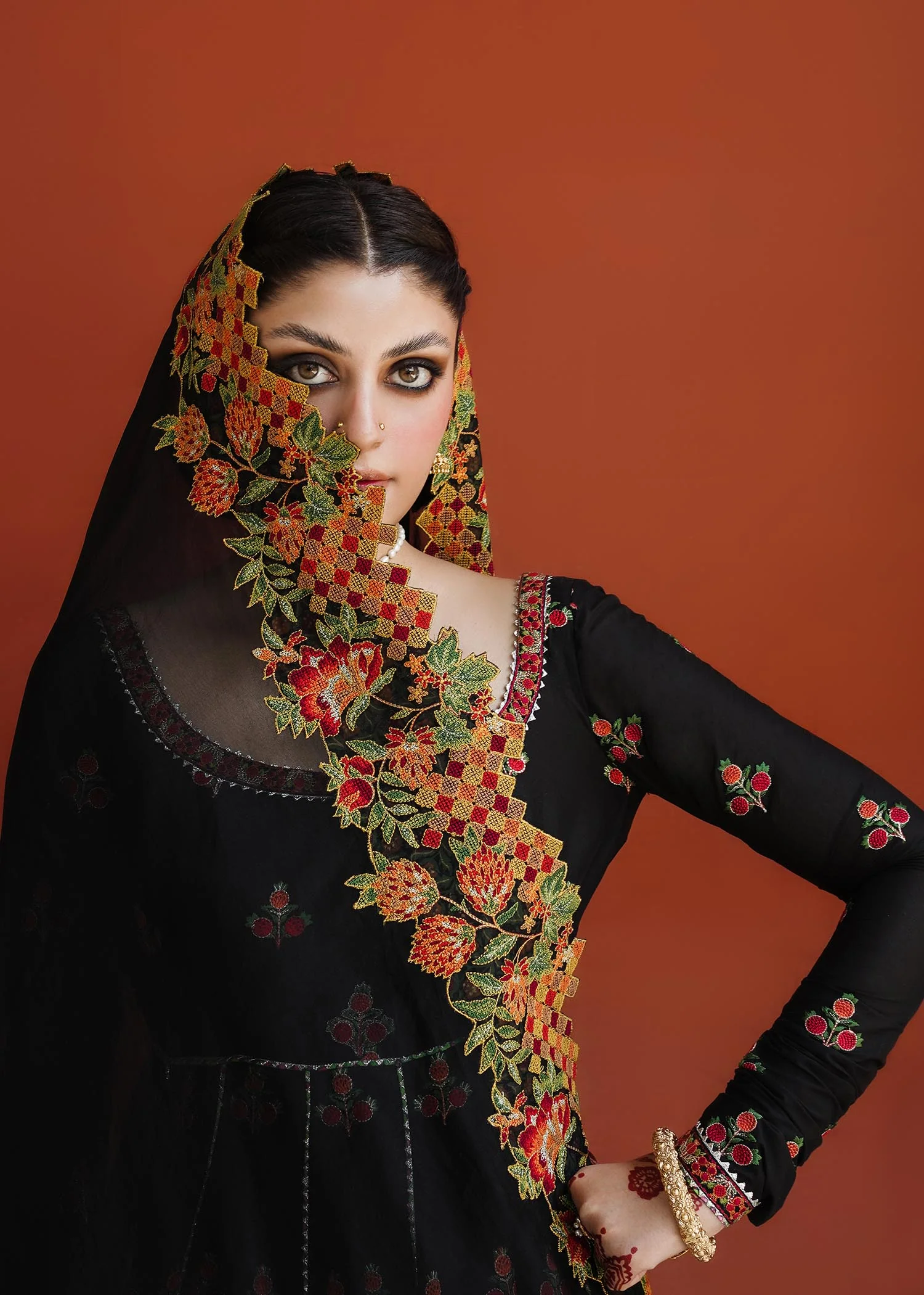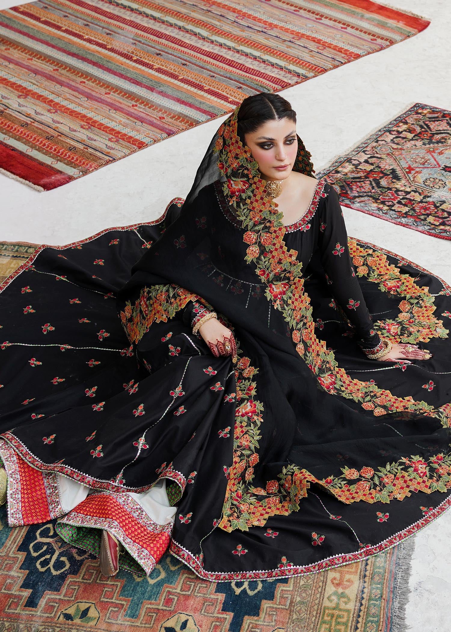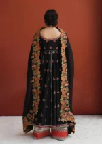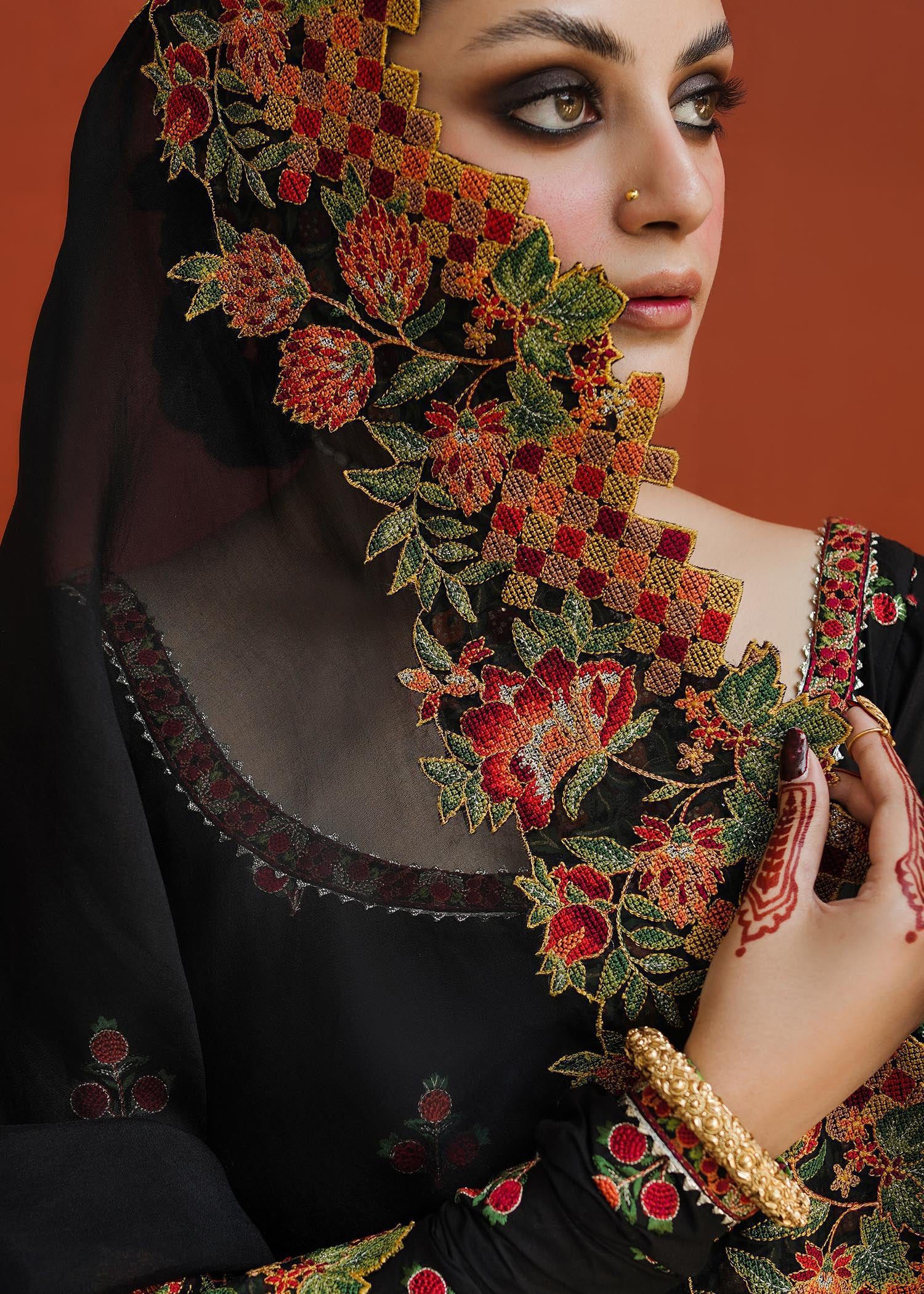 The Siyaah Roop ensemble showcases a stunning panorama of deep-rooted tradition and elegance, featuring intricate embroidery on luxurious fabric. An Anarkali dress with captivating floral patterns and pomegranate accents is complemented by a cross-stitch embroidered organza dupatta in a contrasting shade, paired with a shalwar adorned with ivory-colored block embroidery.