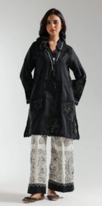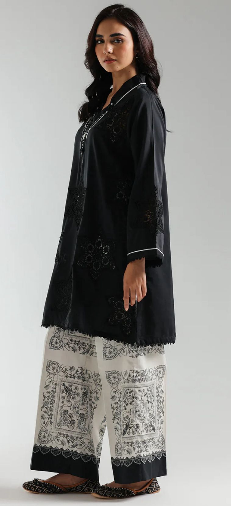 Effortlessly elegant, this jet-black stitched set pairs a modern V-neck shirt—richly embroidered with intricate schiffli florals and framed by scalloped lace at the sleeves and hem—with a fashion-forward printed culotte. A fresh, must-have duo for your spring wardrobe.