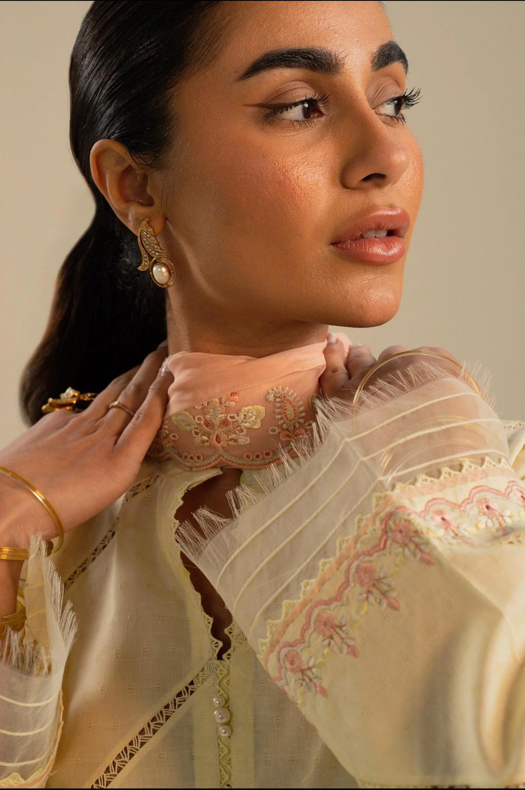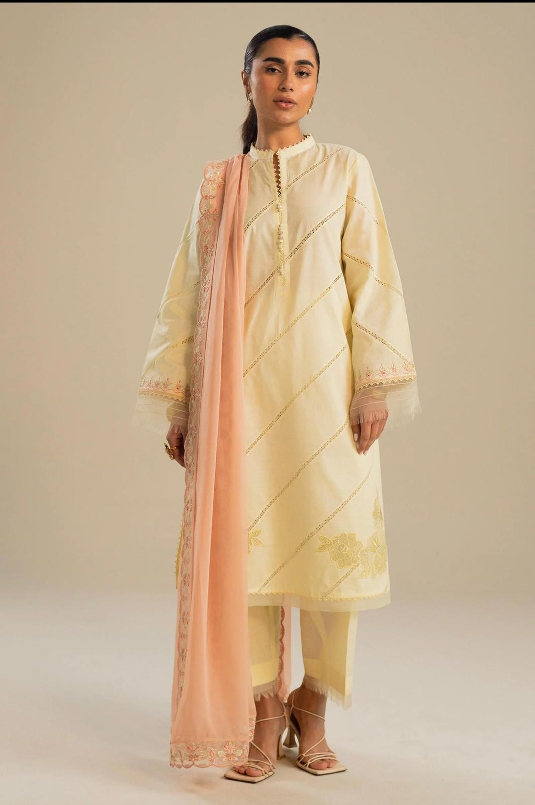 Our yellow kurta is straight-fitting and features daffodil blooms on the front along with diagonal lace insertions. Your carefree appearance is completed with our timeless izaar and a coral dupatta that contrasts with the garment and has schiffli embroidery all over it.