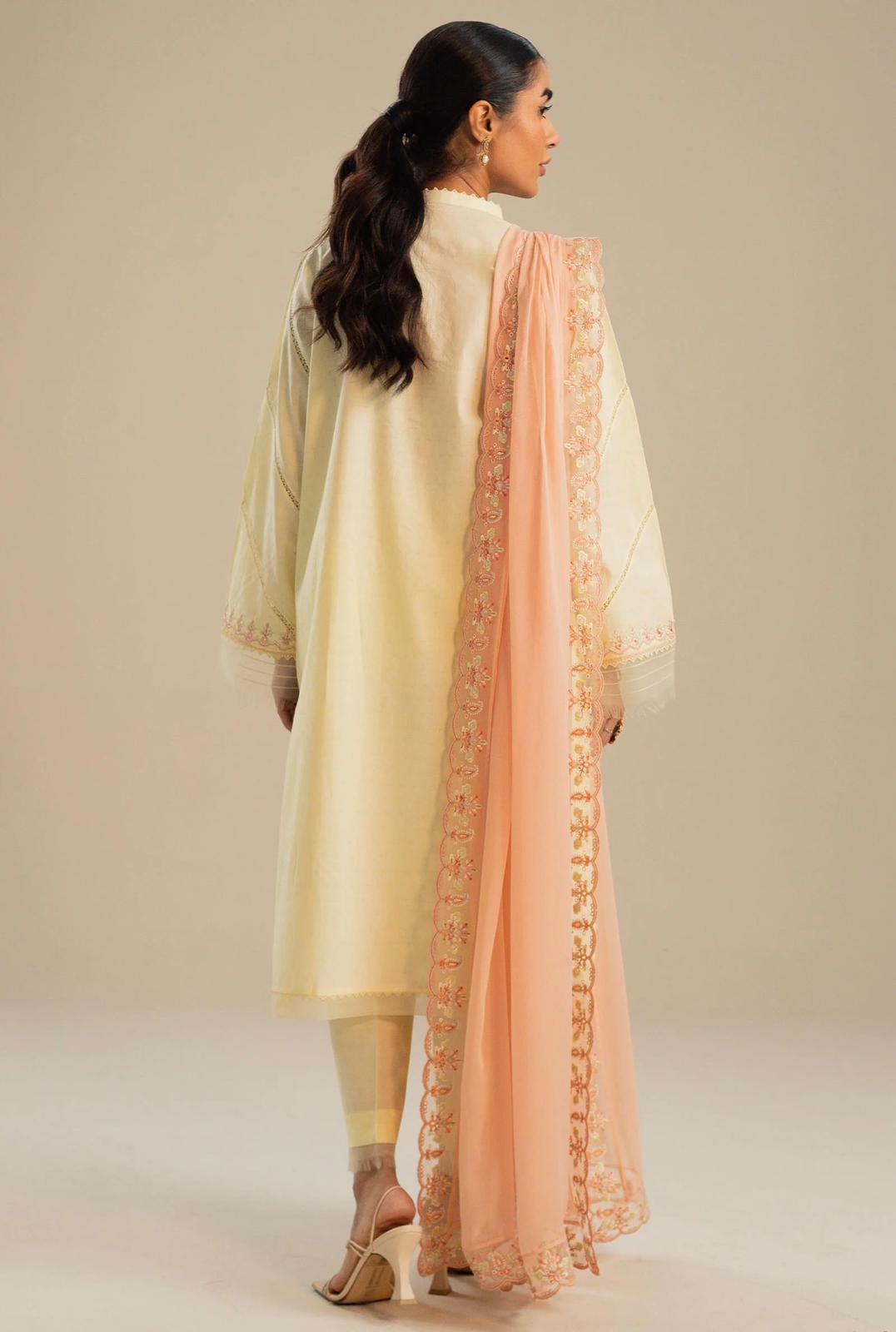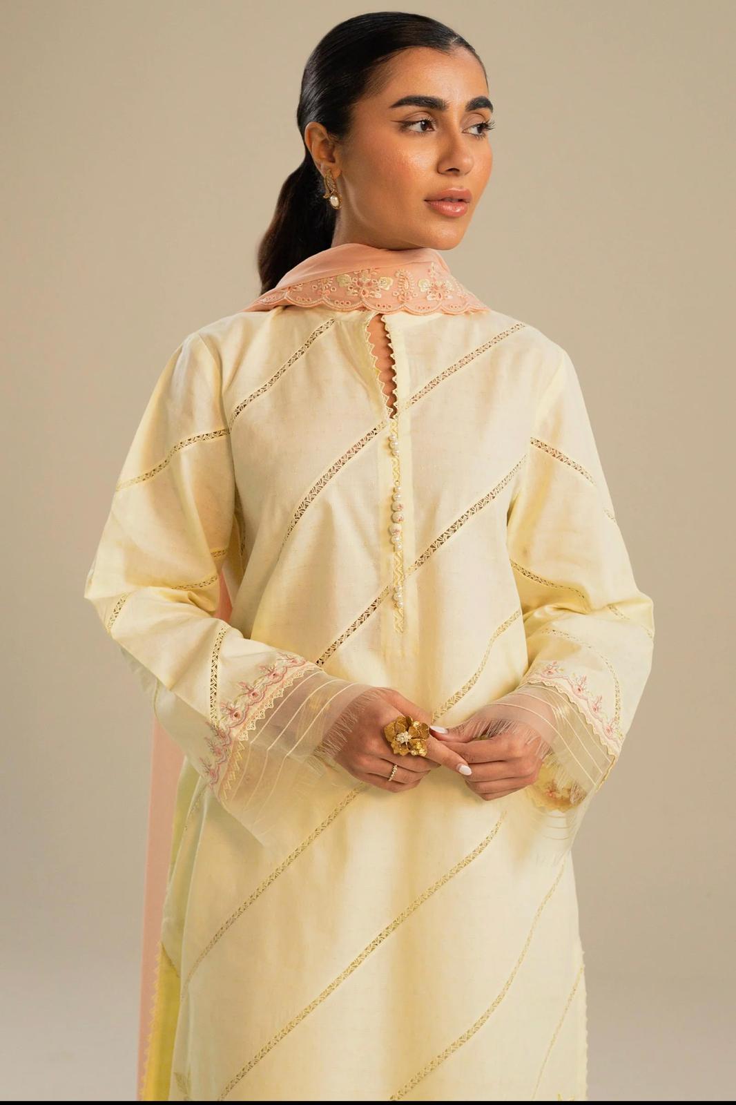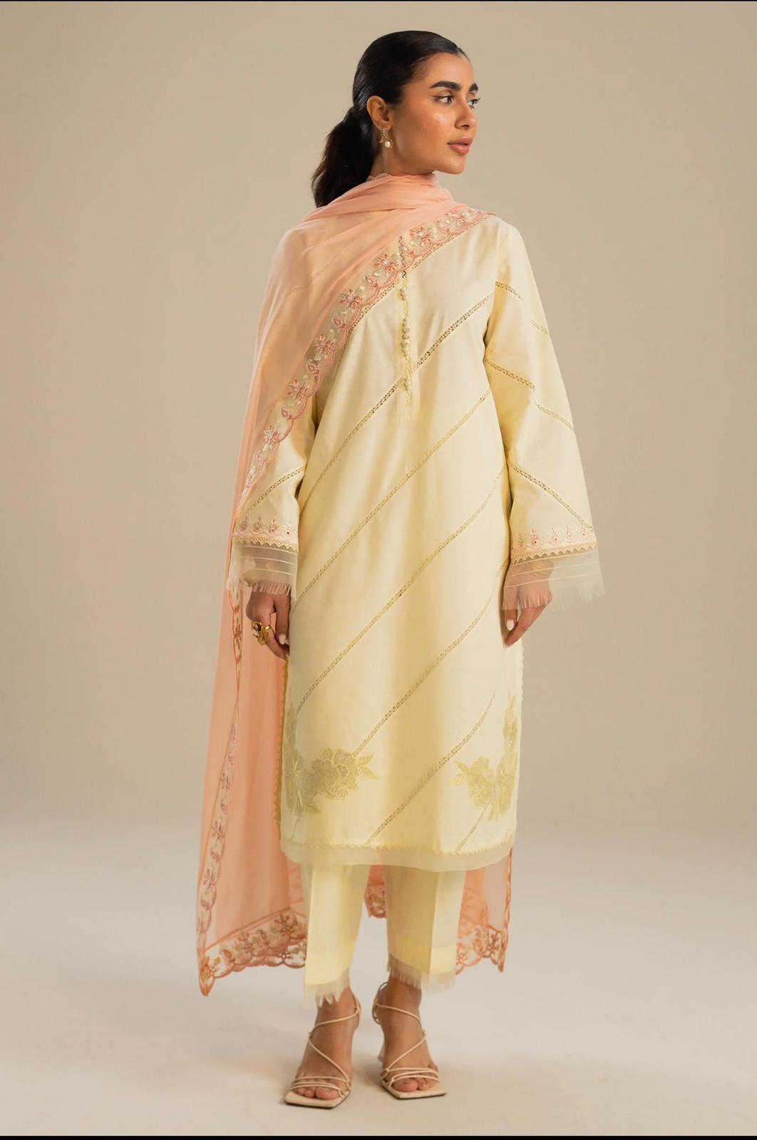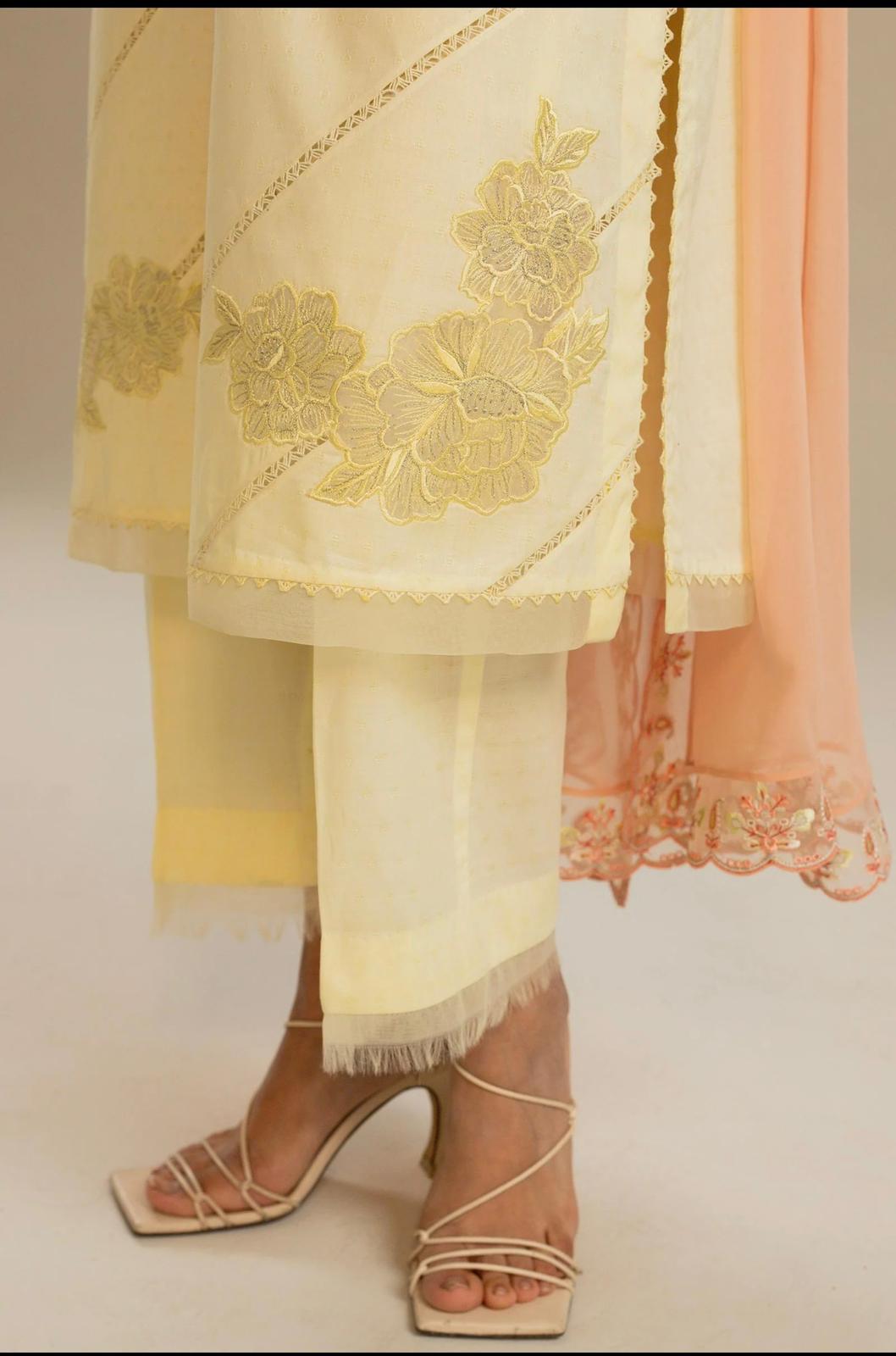 Our straight-fit yellow kurta with diagonal lace insertions and daffodil florals on the front. It is paired with our classic izaar and a contrasting dupatta in coral with schiffli embroidery all over which completes your effortless look.